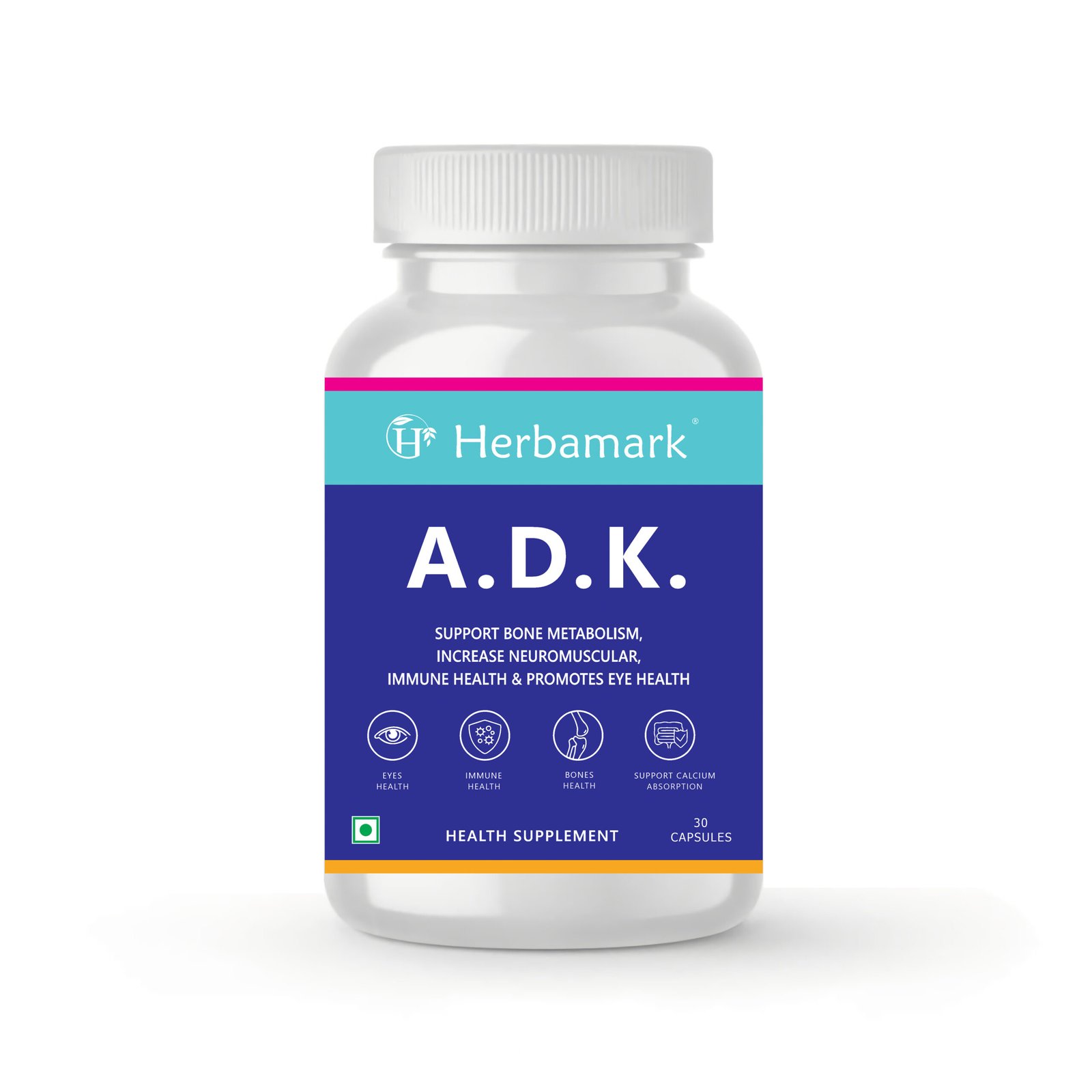 Herbamark A.D.K. Vitamin Capsules | Vitamin A + Vitamin D3 + Vitamin K2 MK-7 | Bone Strength, Immunity & Eye Health Support | Improvs Calcium Absoption | 30 Veg Capsules