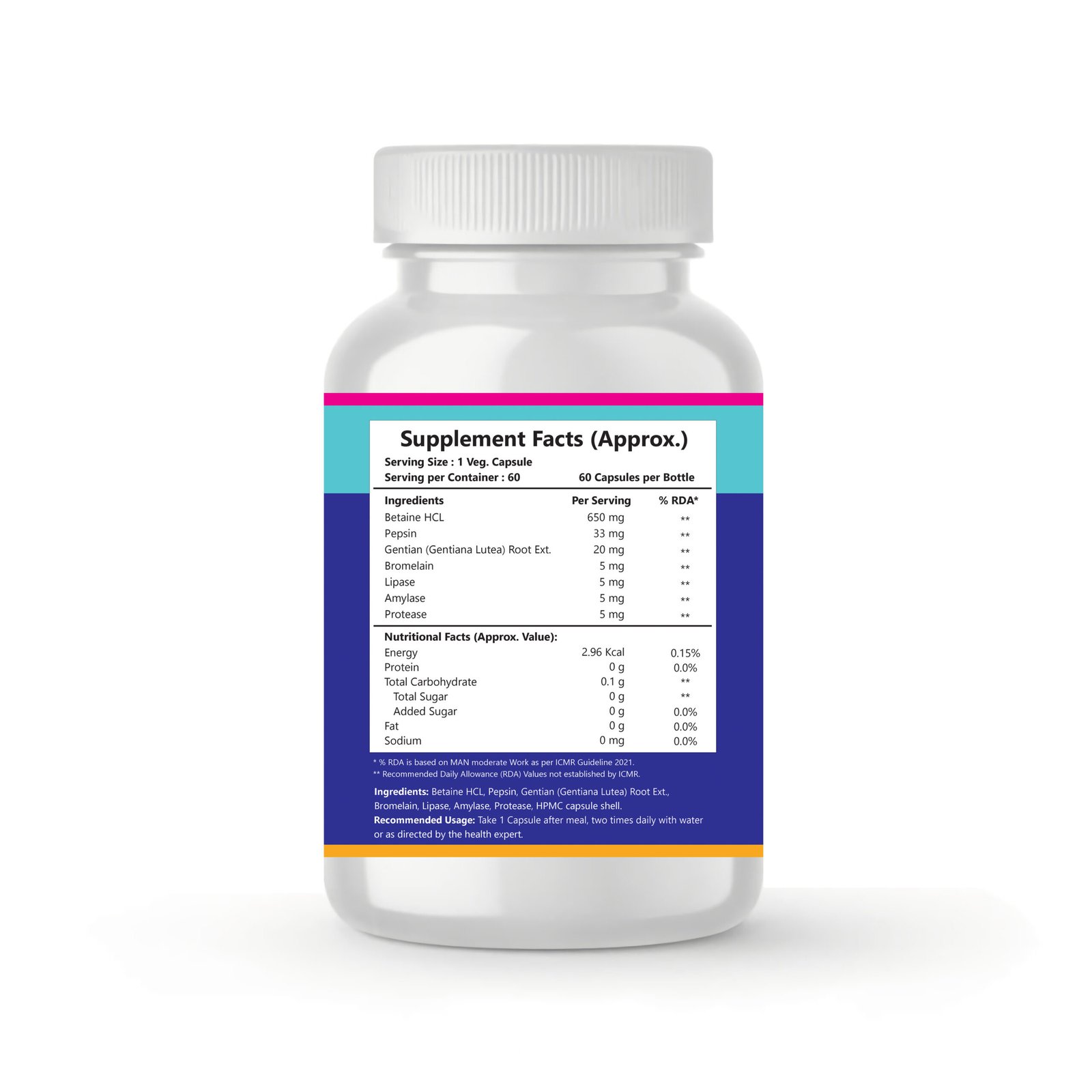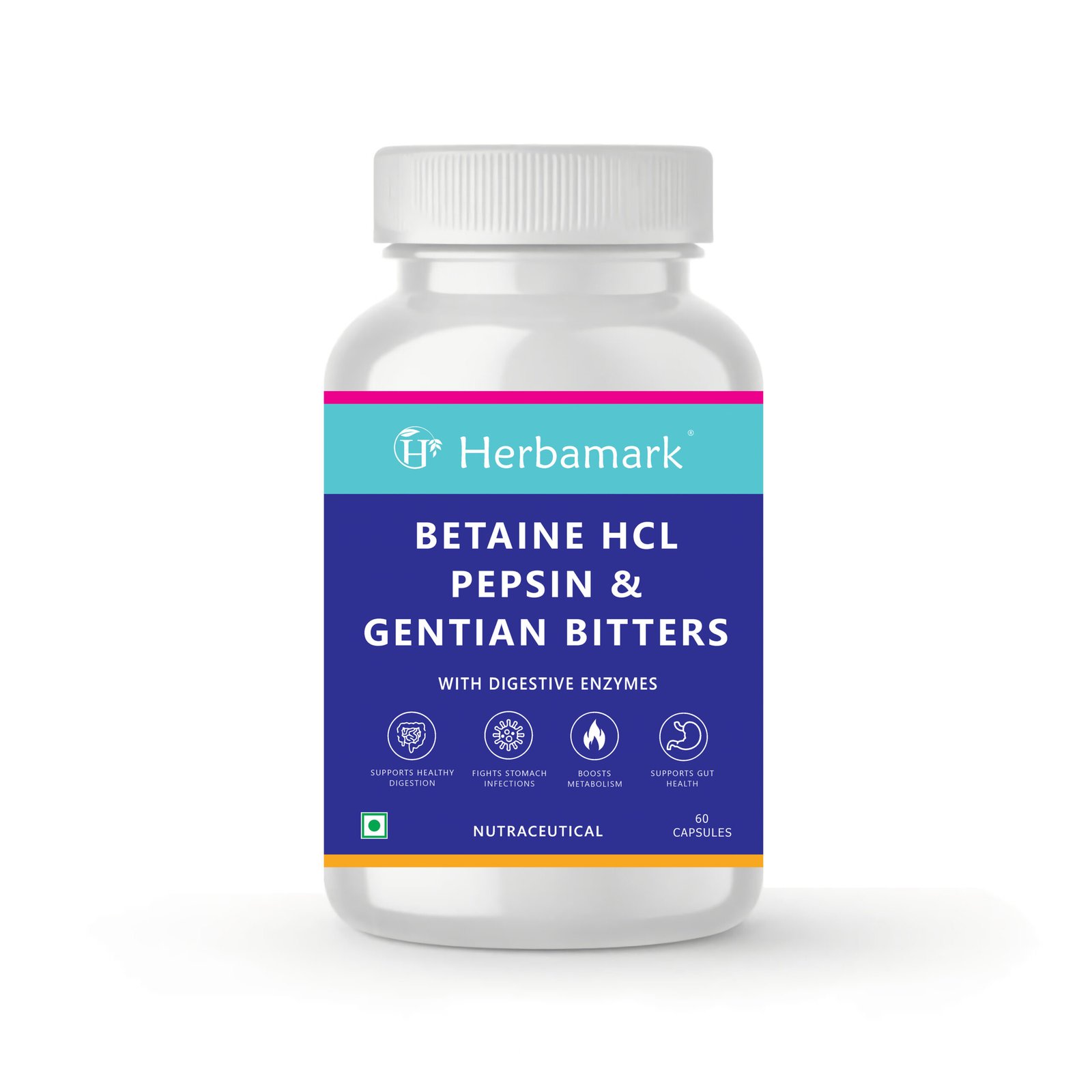 Herbamark Betaine HCL + Pepsin Gentian Capsules with Digestive Enzymes | Supports Digestion, Gut Health & Protein Absorption | Helps Bloating & Acidity Relief | 60 Veg Capsules